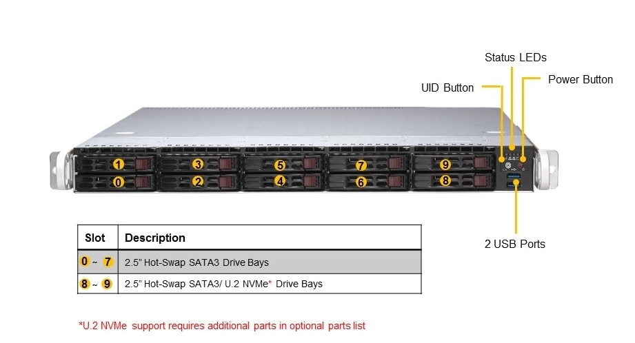 - Drive: Up to 10x 2.5” Hot-Swap SATA Drive Bays. Supports up to 2x U.2 NVMe Drive Bays (Optional)