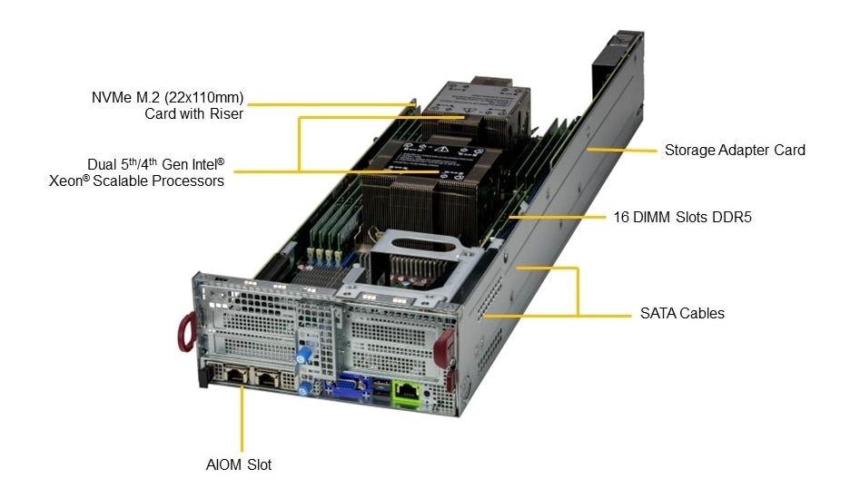 - Drive: Up to 12x 2.5" Hot-Swap NVMe/SATA Drive Bays Per Node (2x PCIe 5.0 NVMe/SATA and 10x PCIe 4.0 NVMe/SATA) + 2x M.2 NVMe